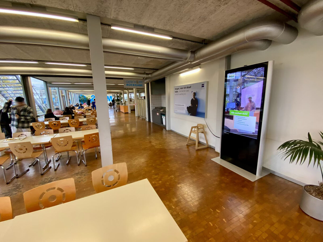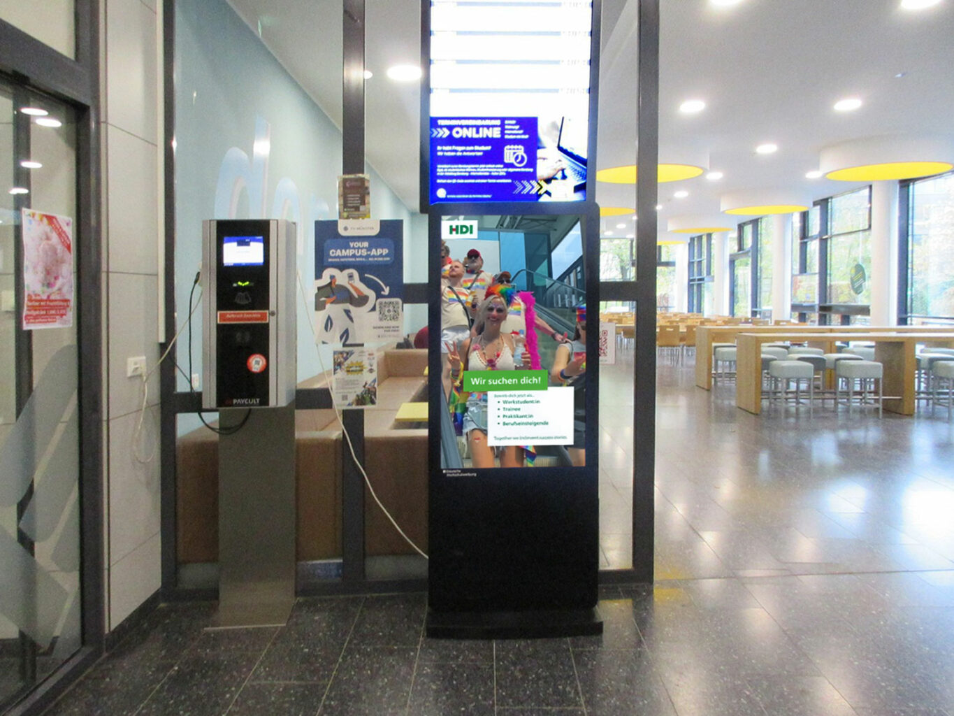 - Platzierung: Zentrale Orte auf dem Campus wie Mensen, Eingänge, Campusachsen